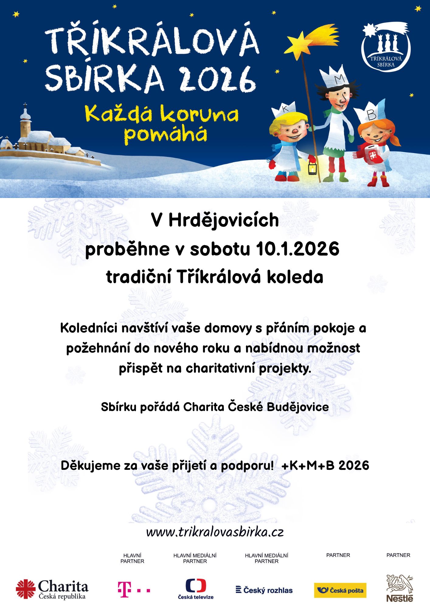 Tříkrálová sbírka 2026 - v Hrdějovicích proběhne v sobotu dne 10.1.2026